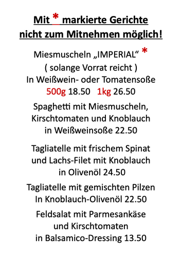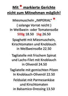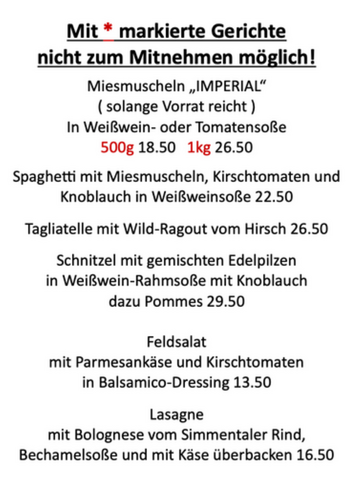 Selbstverständlich können Sie unser Speiseangebot auch bei sich zu Hause genießen. Eine spezielle Karte finden Sie unter „Heimservice“.