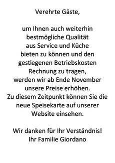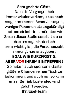 Gastfreundschaft in südländischer, familiärer Atmosphäre hat bei uns eine lange Tradition. Seit den 80er-Jahren sind wir im Südhessischen Ried nunmehr in zweiter Generation erfolgreich. Wir verstehen uns als Restaurant "mit Namen und Gesicht". Persönlichkeit und Respekt gegenüber jedem Gast sind uns ein persönliches Anliegen. Deswegen kommen unsere Gäste "zum Josef". Auch wenn dieser nicht mehr an vorderster Front steht, sind Sie weiterhin Gast bei der Familie Giordano. Der Name "Bei Josef" hat seit Jahrzehnten Tradition und wird uns immer erhalten bleiben.